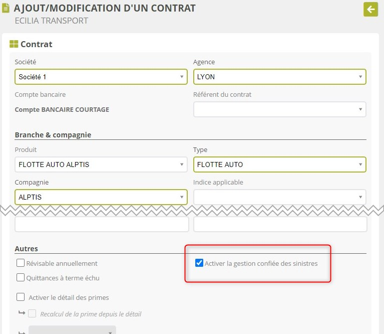 Si vous avez une délégation pour régler les sinistres, vous pouvez activer les fonctionnalités avancées de la gestion des sinistres grâce à l’option de configuration « Activer la gestion confiée des sinistres ». C’est une option réservée au Support ECILIA, merci de nous contacter pour l’activer.