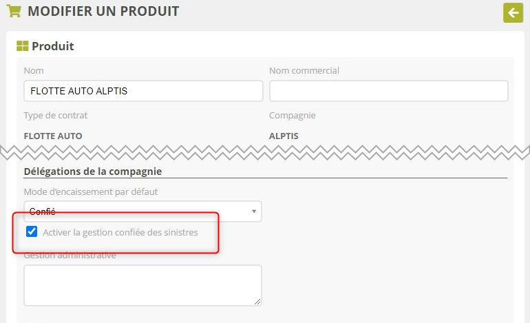 Vous pouvez également activer la gestion confiée des sinistres sur les produits, pour que tous les futurs contrats associés soient automatiquement en gestion confiée.