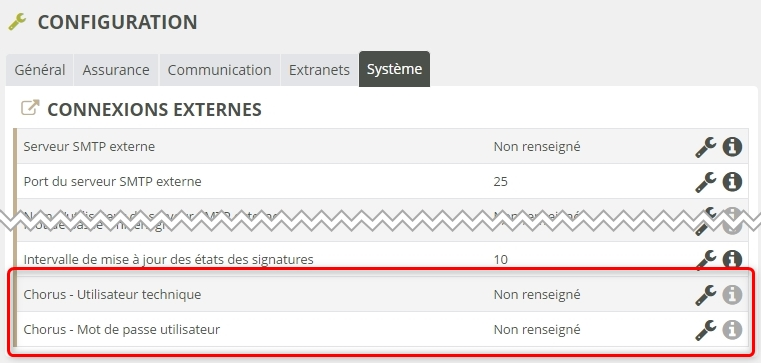 Pour que le menu « Dématérialisation Chorus » apparaisse sur les quittances/factures, il faut avoir configuré la connexion à Chorus Pro : il s'agit du compte technique qui est lié à votre compte Gestionnaire sur le portail Chorus Pro. Cela se traduit par deux paramètres à renseigner dans la configuration de Modulr :