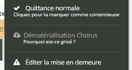 Si le bouton est grisé, il est impossible de dématérialiser la quittance/facture. Cela se produit lorsque la quittance/facture a déjà été envoyée à Chorus Pro.