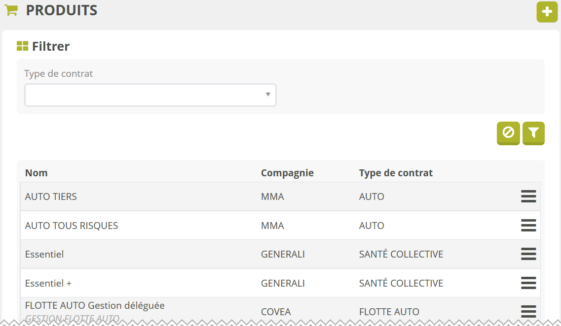 Un produit est rattaché à un type et une compagnie d'assurance. Il peut également être vu comme un « modèle » servant à pré-remplir certains éléments lors de la saisie d'un nouveau contrat (le type, la compagnie, les garanties), ce qui représente un gain de temps sur la saisie.