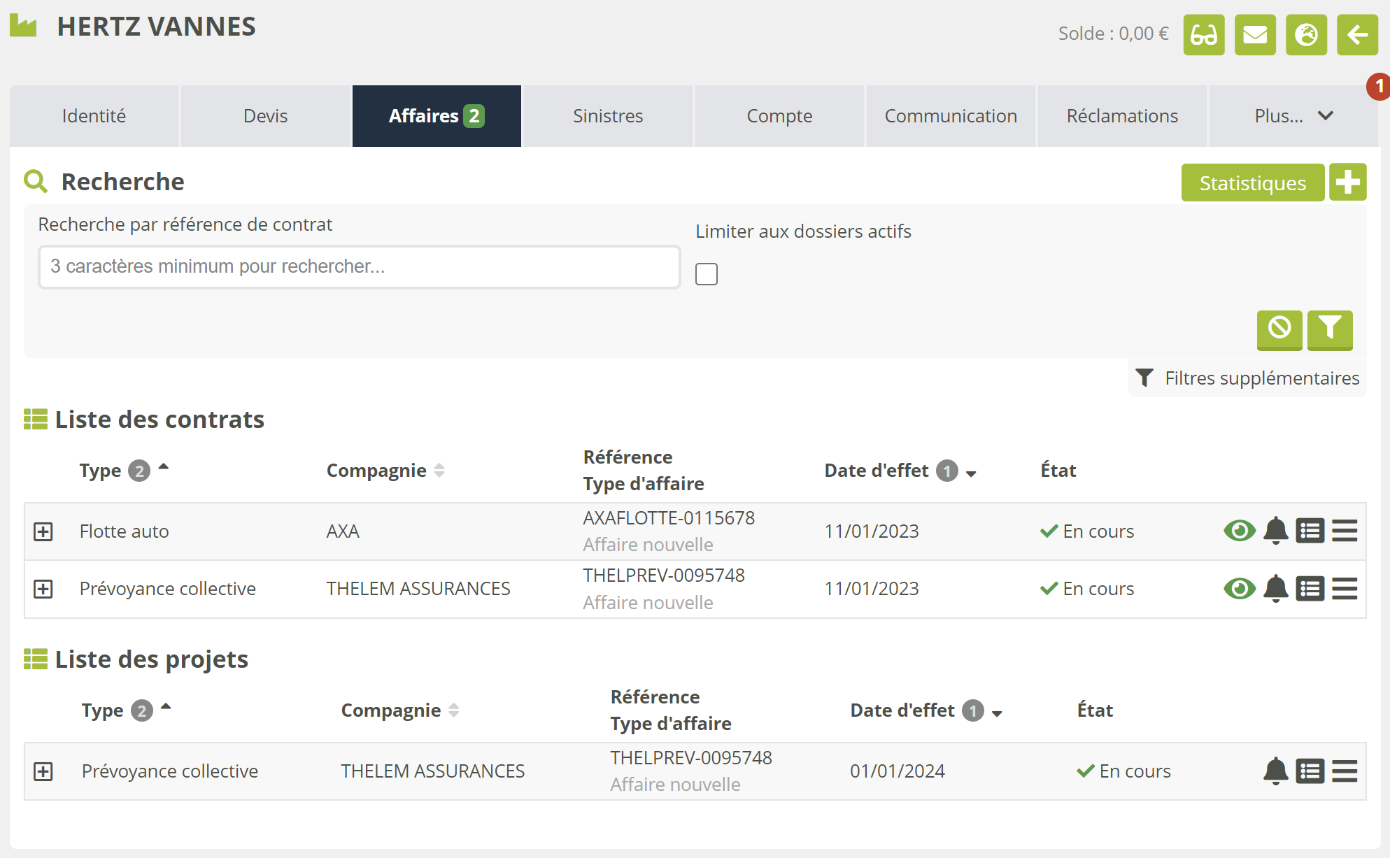 2 | Il existe des contrats en cours sur la fiche, dont le nombre est indiqué. |