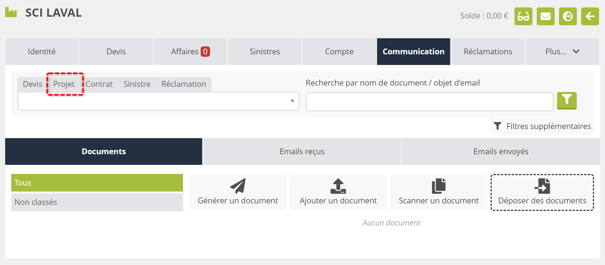 Chaque projet dispose de sa propre GED, tout comme les devis, contrats, sinistres, et réclamations. Dans la section des filtres de l’onglet Communication, vous trouverez désormais un filtre Projet.