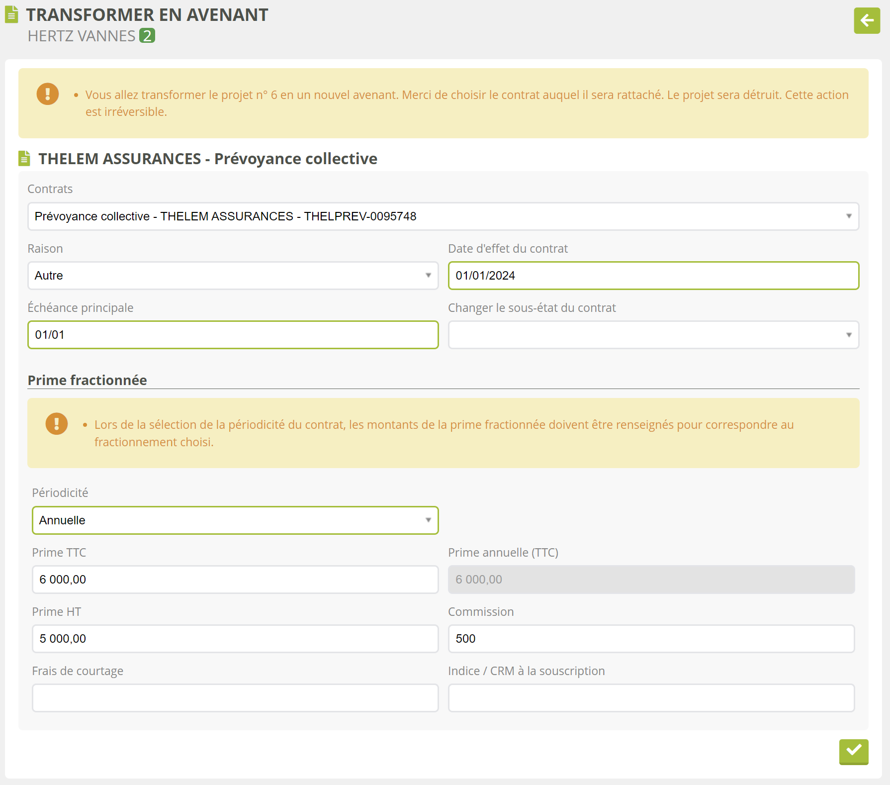 Un projet de contrat peut aussi être un projet d’avenant. Cela vous permet d'étudier dans le détail une révision annuelle ou une demande de modification ayant un impact sur la prime, par exemple. Au lieu clôturer le contrat existant et d'établir un nouveau contrat reflétant ces modifications, vous pouvez ajouter un avenant au contrat existant sans l’interrompre. A cette fin, le projet peut être transformé en avenant depuis son menu d’actions. Une page intermédiaire vous propose alors de choisir le contrat cible, de compléter les informations qui deviennent obligatoires pour un avenant de contrat en cours, et vous permet quelques modifications de dernière minute :