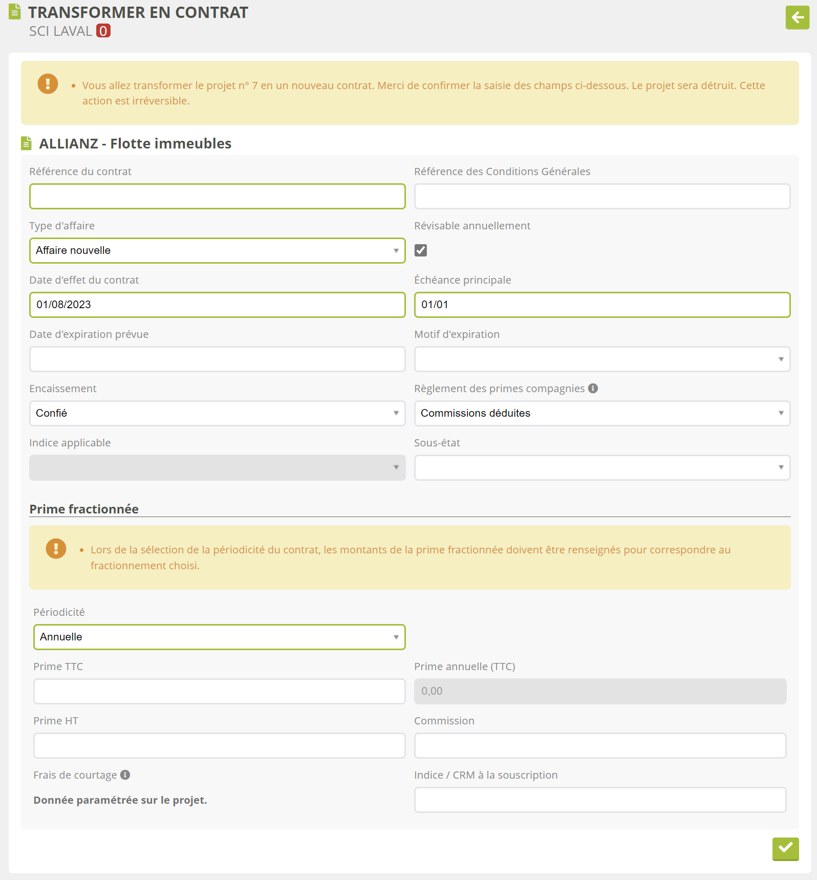 Si aucun document attendu obligatoire ne bloque cette action, vous pouvez transformer un projet en contrat sur la fiche du client. Un écran de saisie vous propose de compléter les données qui, dans le cadre d’un contrat effectif, deviennent obligatoire. Vous pouvez du même coup effectuer quelques retouches de dernière minute :