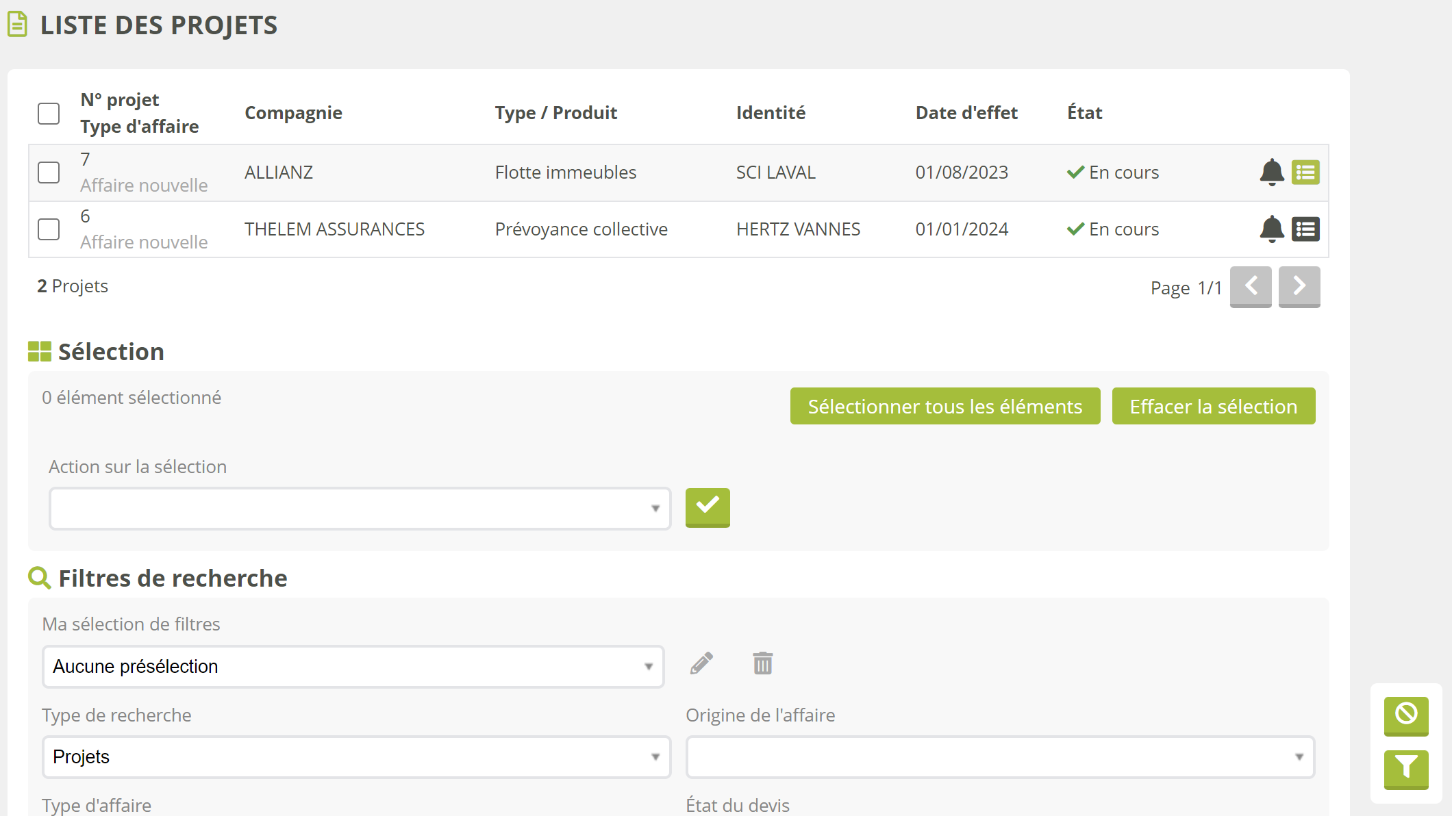 En revanche, les filtres sont en nombre plus réduit car il n’est pas possible de créer des quittances et des factures sur un projet de contrat, donc de filtrer sur des éléments de facturation.