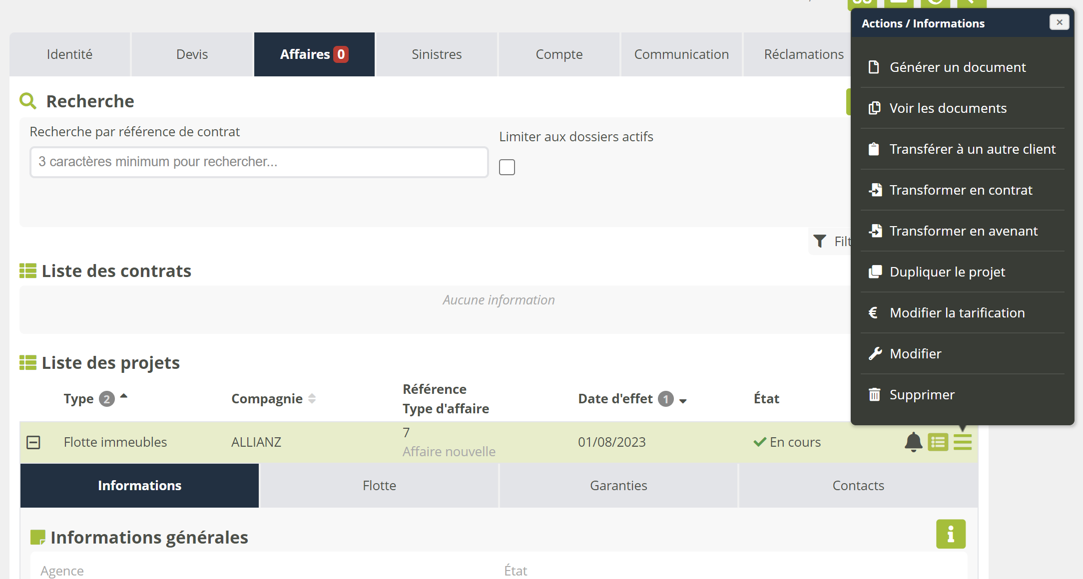 L’onglet Contrats se transforme en onglet Affaires, qui regroupe contrats et projets.