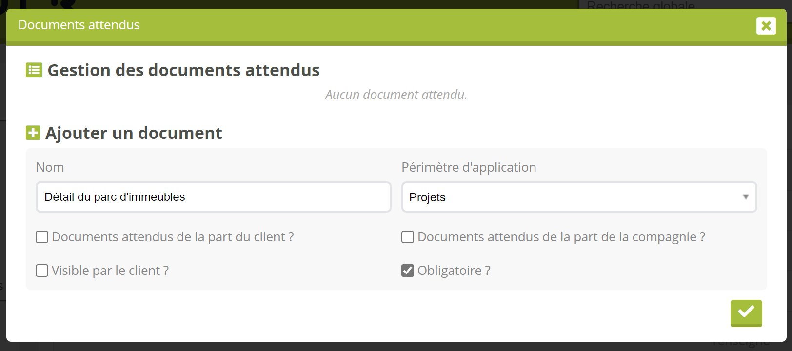 Lorsque vous ajoutez un élément à la liste des documents attendus, il est possible de cocher une case obligatoire. Dans le cadre des projets, cette option permet de bloquer la transformation du projet en contrat ou en avenant tant que tous les documents obligatoires du projet n’ont pas été reçus (càd cochés en vert dans la liste).