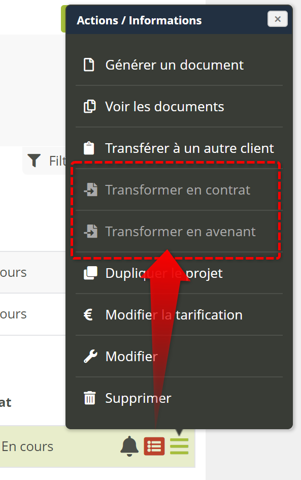 Transformer en contrat : permet de transformer le projet en contrat effectif, uniquement si TOUS les documents attendus notés comme