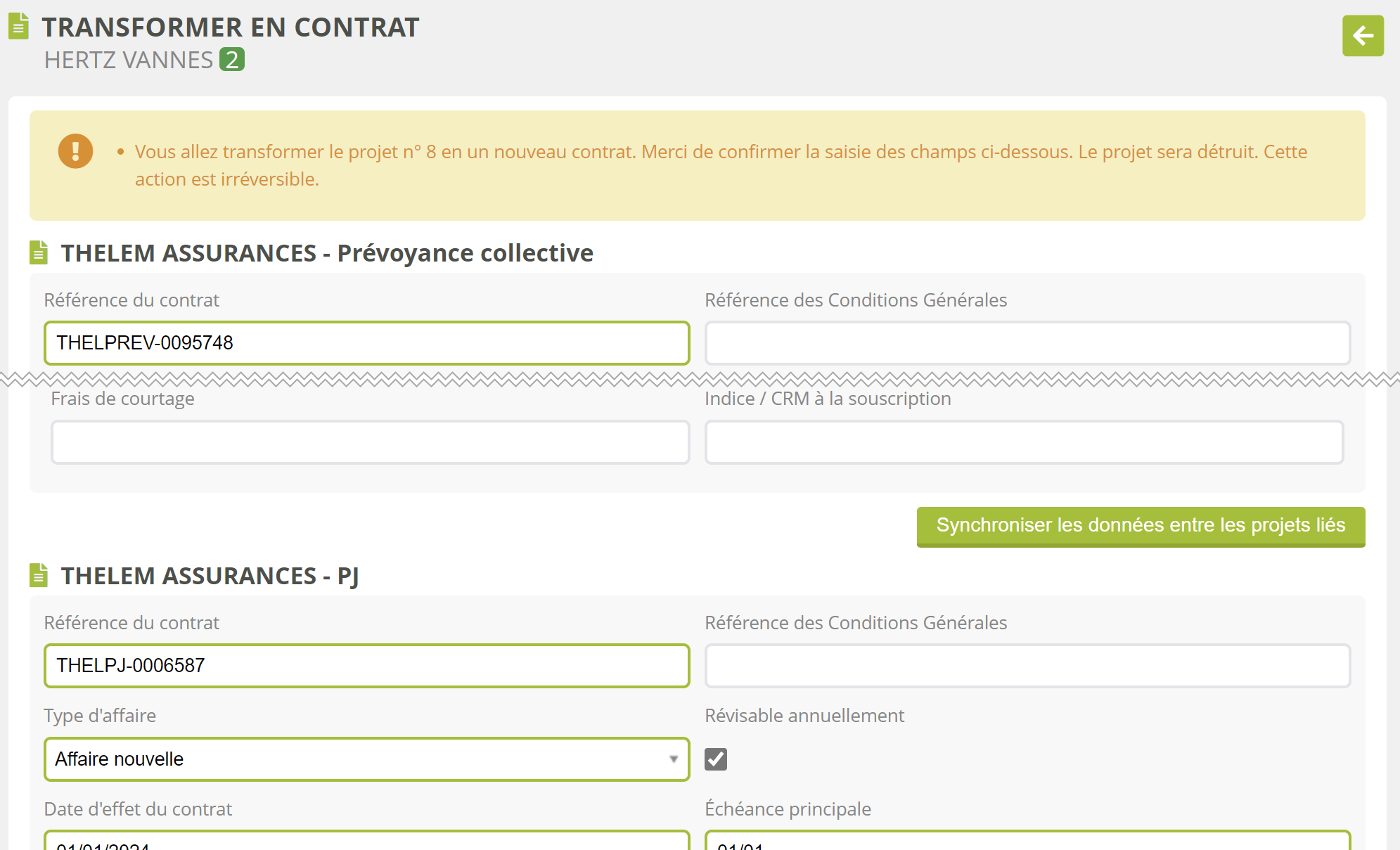 En complément, un bouton Synchroniser les données enter les projets liés permet de répliquer les données du projet parent (le premier de la liste) sur tous les projets enfants (ceux situés après le bouton). Très utile pour gagner du temps si tous les futurs contrats ou avenants doivent suivre la même périodicité, débuter à la même date…