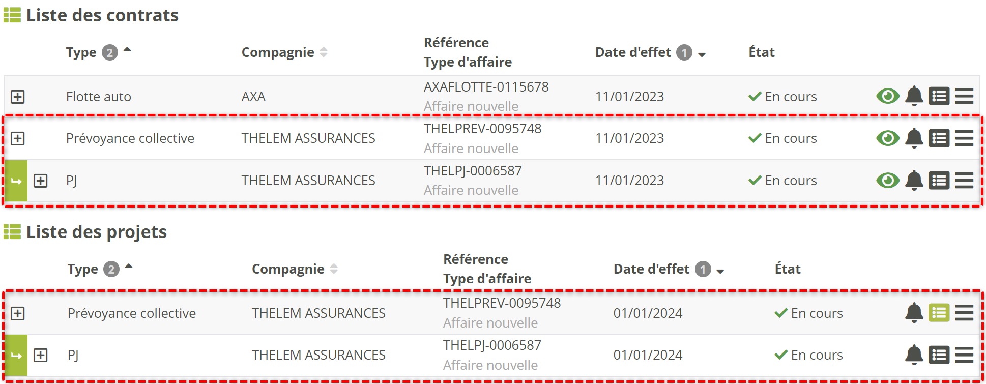 La page Projets se présente de la même façon que celle des contrats.