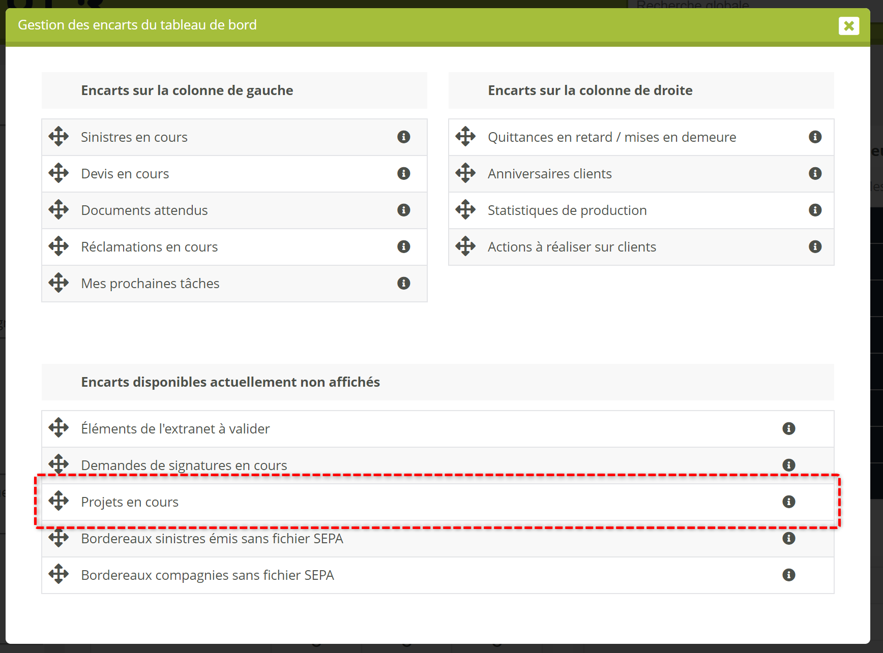 Le nouvel encart de tableau bord est disponible parmi les encarts non affichés, dans la fenêtre de gestion des encarts :