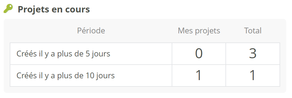 chacune déclinée en le nombre de projets associés à l’utilisateur courant, et le nombre de projets tous utilisateurs confondus.