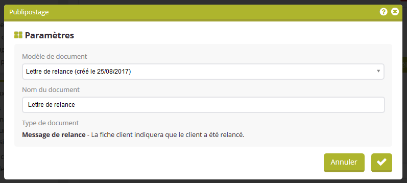 Les modèles de documents peuvent être de différents types : « Message de relance », « Avis d'échéance », « Relance pour les quittances impayées »… auquel cas un traitement particulier sera déclenché en même temps que la génération du document final (voir l'article Relance et échéance).