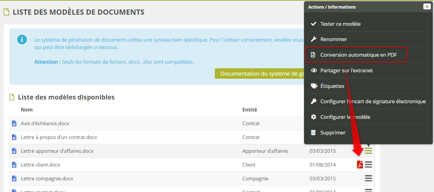 Préparez votre modèle de document comme décrit dans l’article Modèles de documents, mais veillez à activer la Conversion automatique en PDF depuis le menu d’actions du modèle :