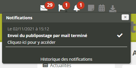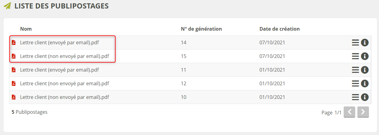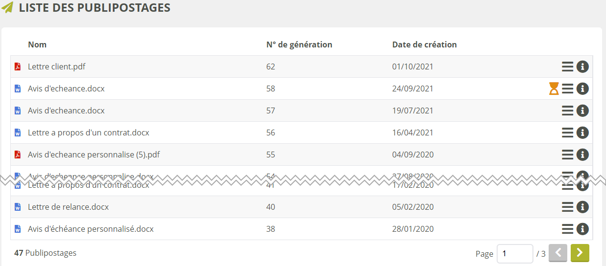 Enfin la liste des publipostage propose les plus récents en premiers. La liste est paginée : vous pouvez retrouver les publipostages les plus anciens en parcourant les pages de résultats suivantes.