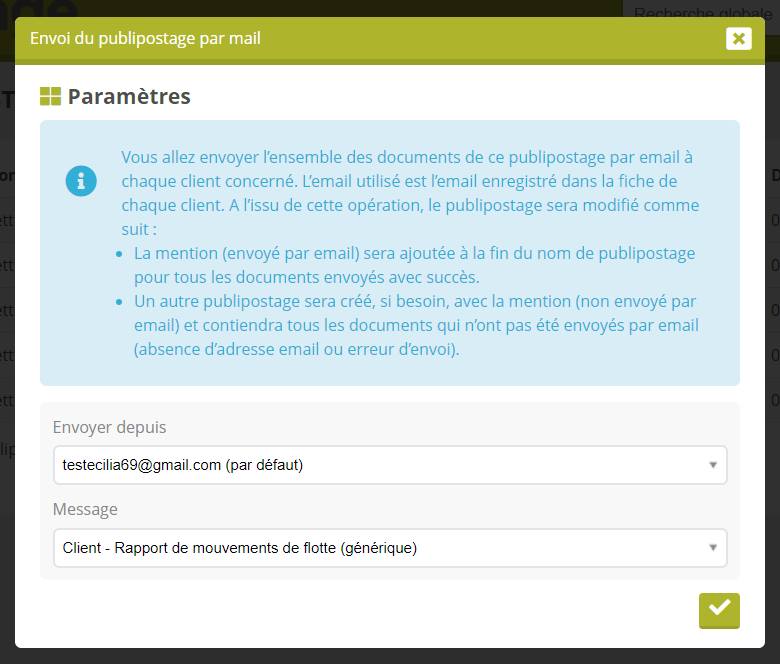 Dès que vous disposez d’un publipostage PDF, depuis la section Publipostages vous pouvez utiliser l’action de menu “Envoyer les documents par email au client”.