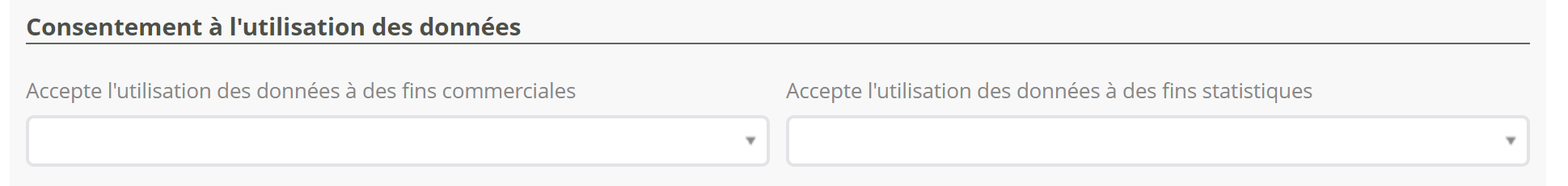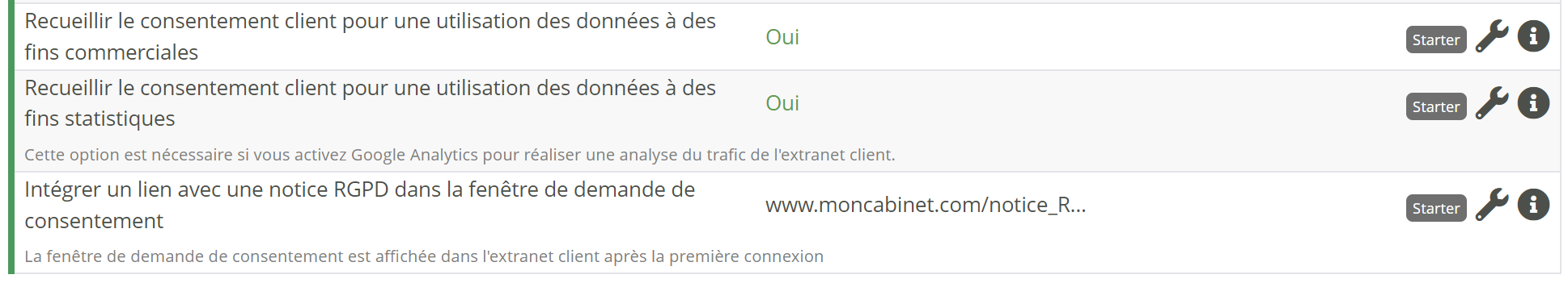 Recueillir le consentement client pour une utilisation des données à des fins commerciales: conditionne l'utilisation des campagnes d'emailing depuis Modulr.Recueillir le consentement client pour une utilisation des données à des fins statistiques: permet d'activer un tracking Google Analytics sur les pages de l'extranet client.Recueillir le consentement client pour le partage des données aux filiales et partenaires: à titre informatif, pour votre gestion interne, notamment si vous devez envoyer des offres comportant des données personnelles aux assureurs ou à vos délégataires de gestion.