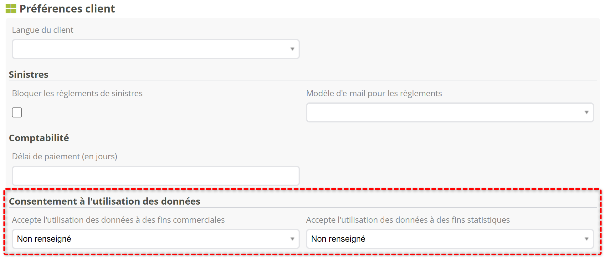 Dans la section des Préférences clients de la fiche client, vous pouvez renseigner vous-mêmes les préférences du client :