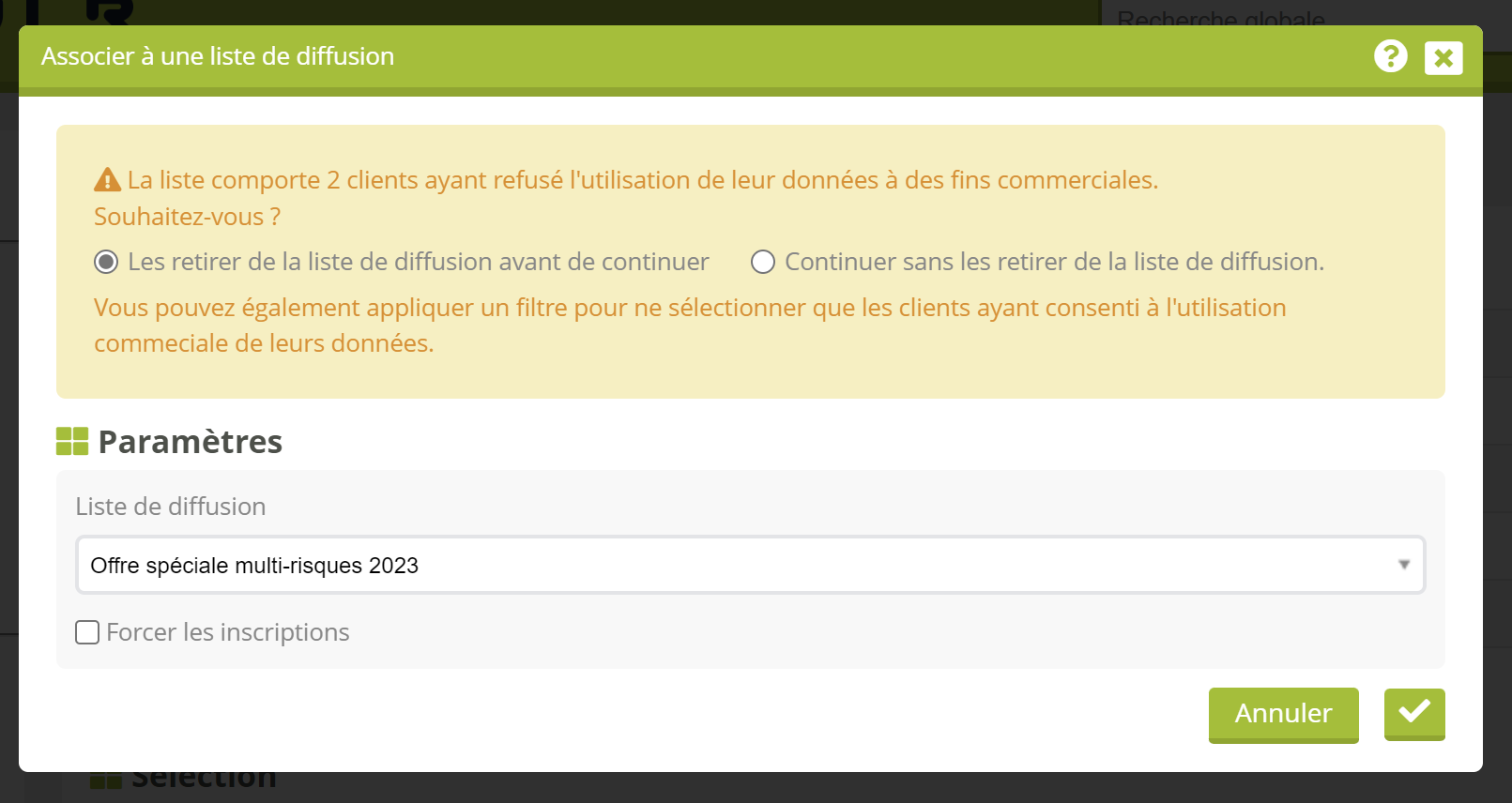 Vous aurez alors la possibilité de respecter le choix des clients, ou de les inscrire malgré tout à la liste de diffusion, si la campagne n’est pas à usage commercial (par exemple, une simple newsletter).
