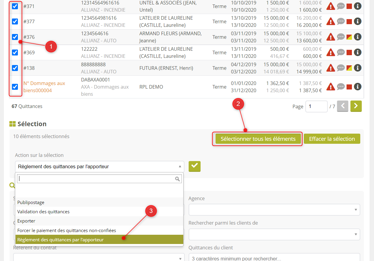 Sélectionnez les quittances réglées par le courtier. Il est vivement conseillé d’utiliser au moins les filtres suivants en premier lieu :