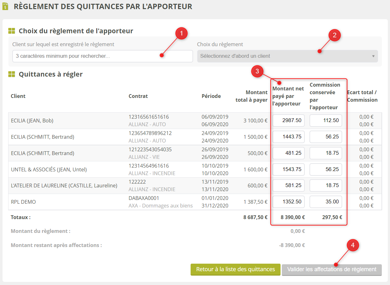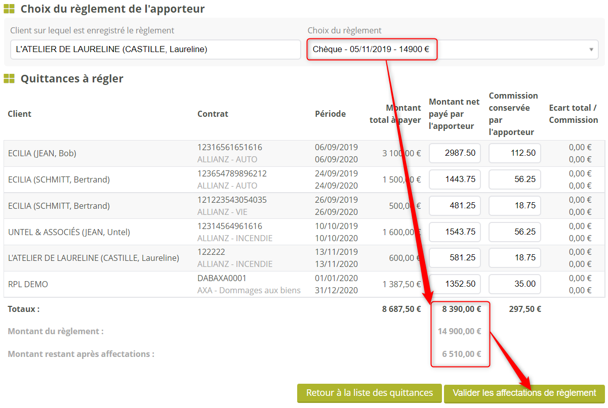 Le paiement sélectionné est affecté à toutes les quittances à hauteur du montant indiqué dans la colonne “Montant net payé par l’apporteur”.