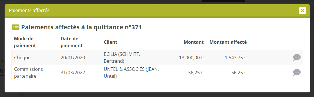 Un nouveau paiement de type “Commission apporteur” est généré automatiquement sur chaque fiche client, du montant de la commission retenue par l'apporteur. Ce paiement est affecté automatiquement à la quittance correspondante pour la solder complètement.