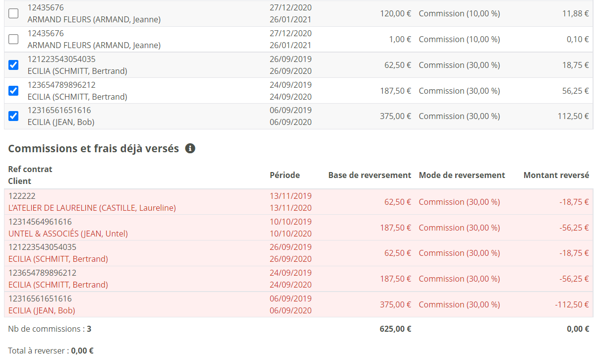 Les commissions qui ont déjà été retenues à la source par le courtier partenaire apparaissent sur 2 lignes :