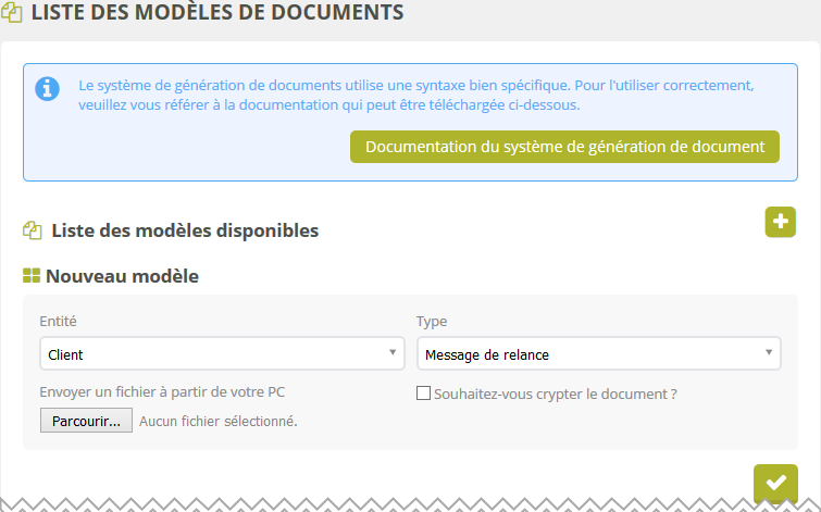 Message de relance. Ce type de modèle ne peut être utilisé que pour l'entité « Client ». Il vous permet de générer des messages de relance depuis la liste des clients.