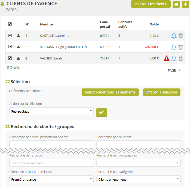 Une fois le filtre appliqué, vous pouvez sélectionner les clients concernés par le publipostage et générer le document final (voir l'article « Publipostage »).