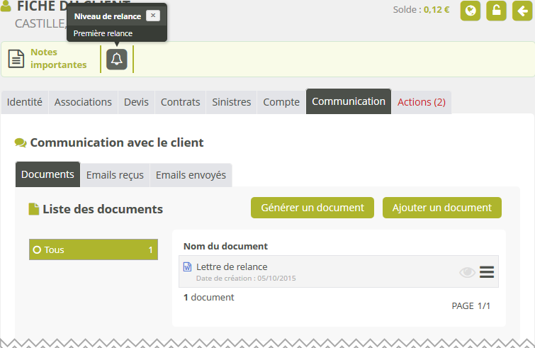Le document est enregistré dans la liste des documents de la fiche du client et dans les documents liés aux contrats.