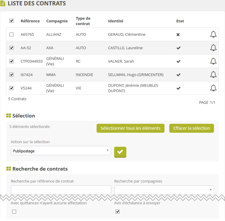 Une fois le filtre appliqué, vous pouvez sélectionner les contrats concernés par le publipostage et générer le document final (voir l'article « Publipostage »).