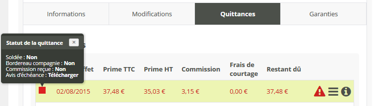 L'avis d'échéance apparaît sur la fenêtre pop-up affichée au survol de la souris sur l'icône du statut de la dernière quittance des contrats concernés.