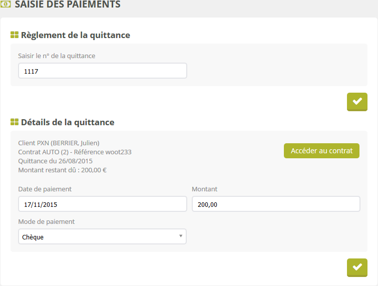 Pour utiliser cette interface, il faut disposer du numéro de la quittance à payer. Ce numéro peut être inscrit sur un talon à découper sur le courrier type d'avis d'échéance qui le client retourne avec son chèque par exemple. Vous retrouverez ce numéro dans les informations supplémentaires de chaque quittance dans le détail des contrats d'un client.