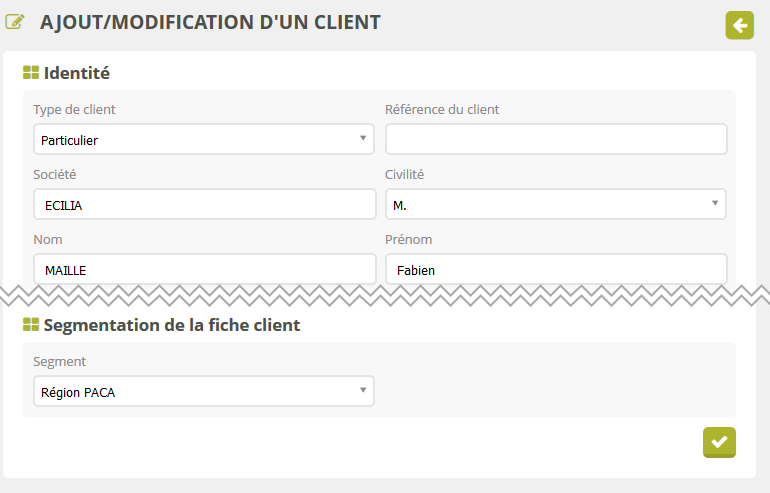 Attention, si la fiche client ne possède pas de segment, elle sera visible par tous les utilisateurs même si l’utilisateur a un segment spécifique attribué.