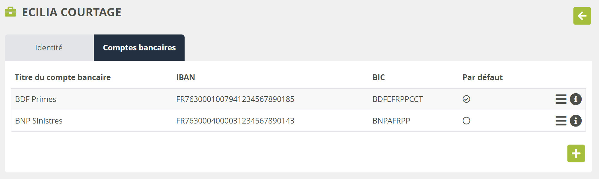 En ouvrant la fiche d'une société, un onglet Comptes bancaires permet de renseigner les différents comptes bancaires utilisés pour votre activité avec cette société.