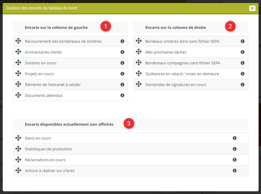 1. Cette colonne liste les encarts actuellement affichés dans la partie gauche de votre tableau de bord.