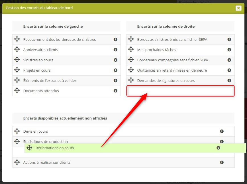 Pour ajouter un de ces encarts à votre tableau de bord, il suffit de glisser-déposer l’encart directement sur la colonne gauche ou droite, à l’emplacement de votre choix.