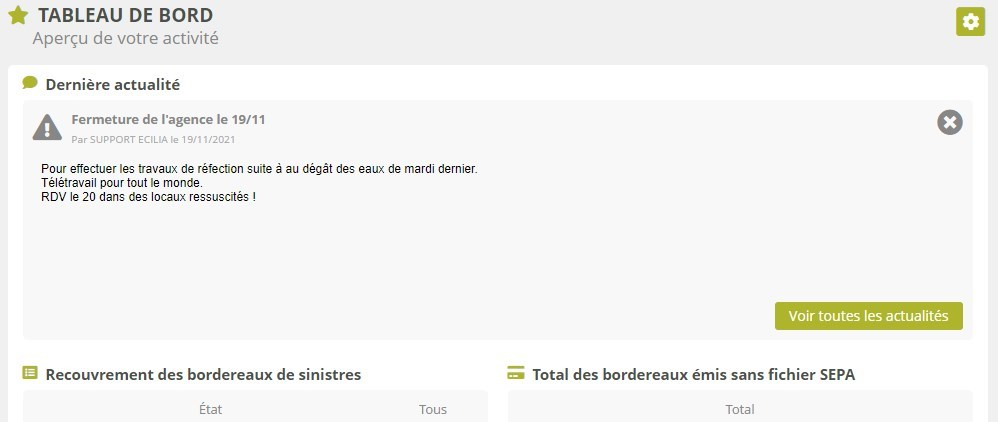 Le bloc dernière actualité est le seul encart du tableau de bord qui ne peut être repositionné ou retiré.