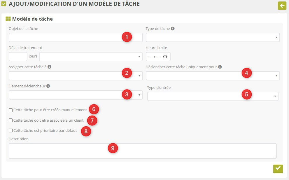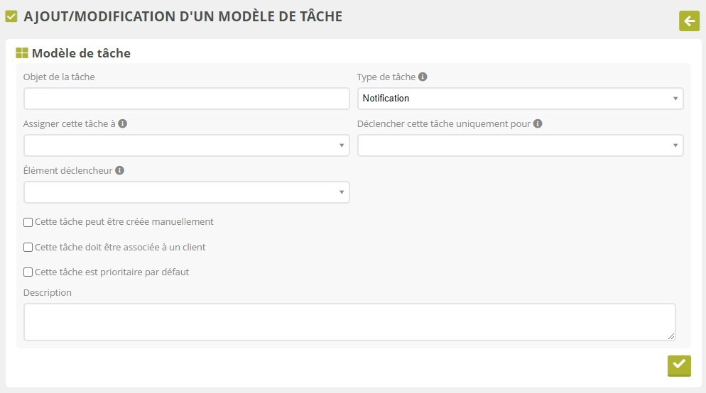 Cette tâche doit être associée à un client : Facultatif ; si la case est cochée, indique que la tâche doit être liée à un client : elle ne pourra donc pas être créée en dehors d'une fiche client. Laissez la case décochée pour des tâches génériques ou sans lien avec un client.
