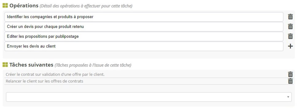 +pour en ajouter une autre. Pour terminer la tâche, un utilisateur devra valider chacune de ces étapes individuellement.Tâches suivantes : Facultatif ; propose une ou plusieurs tâches pouvant être générées d'un clic lorsque vous terminez cette tâche. La liste propose les modèles de tâches existants. Il faut donc avoir préparé à l'avance les modèles des tâches subséquentes (voir « Créer des chaînages de tâches prédéfinies »).