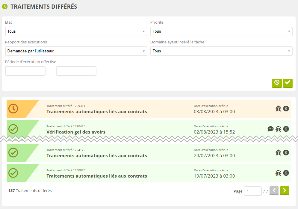 Cet écran est uniquement consultatif. Vous pouvez filtrer et consulter les différentes tâches différées, ce qui vous permettra par exemple de vous assurer que la prochaine relance des impayés se fera bien à 22h00, ou que votre agenda partagé a bien été synchronisé le jour même.