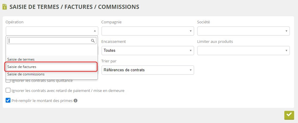 Dans les critères de génération en haut de page, sélectionnez simplement « Saisie de factures » :