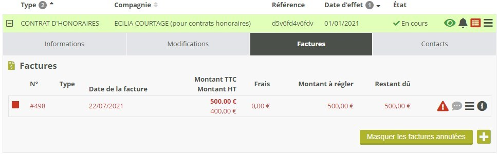Au lieu d’un onglet « Quittances » un contrat d’honoraires dispose d’un onglet « Factures », qui permet uniquement de gérer et de créer des factures d’honoraires.