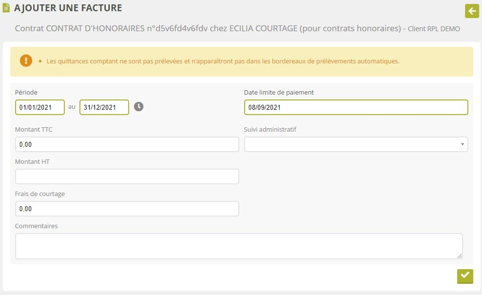 Si vous avez saisi dans vos avenants les montants récurrents de facturation dans la section « prime fractionnée », ces montants seront rappelés ici à la création d’une nouvelle facture.