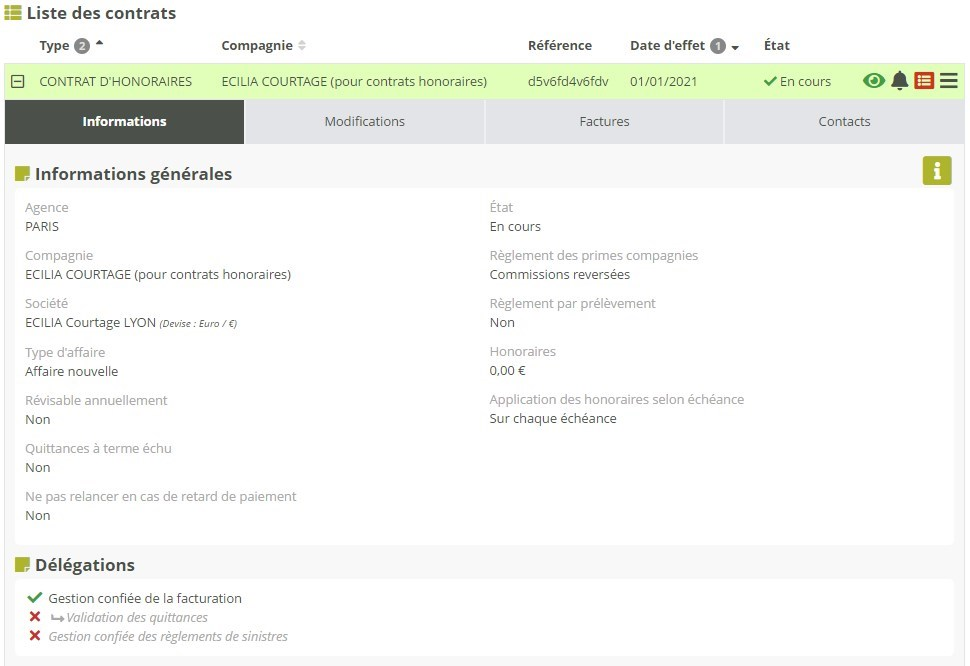 A cette fin, Modulr permet de gérer des contrats d’honoraires, à part des contrats d’assurances, afin de facturer vos propres prestations aux clients. Ces contrats ne génèrent pas de quittances, mais des factures d’honoraires, que nous appellerons simplement « factures » dans Modulr, par opposition aux « quittances » d’assurance.