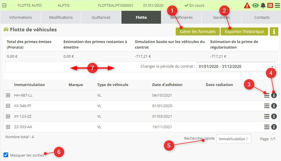 6. Cette case permet d’afficher tout l’historique des mouvements de cette flotte. Par défaut, on n’affiche que la flotte active (véhicules non radiés).