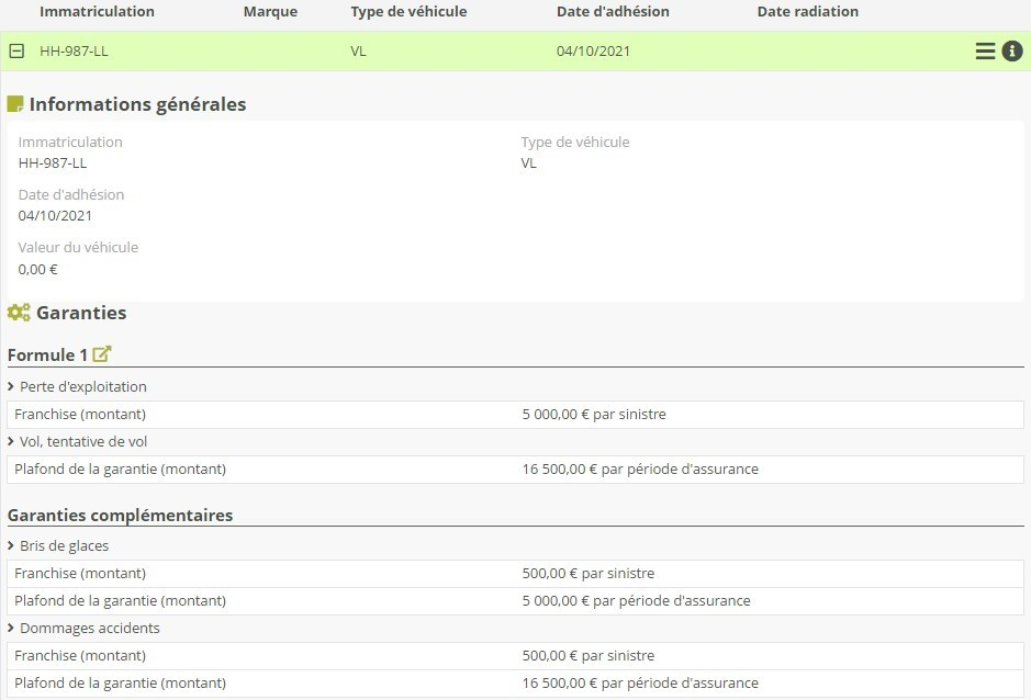 En cliquant sur un véhicule vous dépliez un volet qui recense toutes les informations saisies, incluant d'éventuels champs personnalisés. Vous pouvez en outre visualiser la formule sélectionnée et les garanties associées.