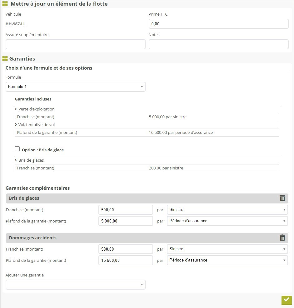 Pour plus de détails dans la gestion des formules de garanties, consultez les guides Formules de garanties et Gestion des flottes de véhicules.