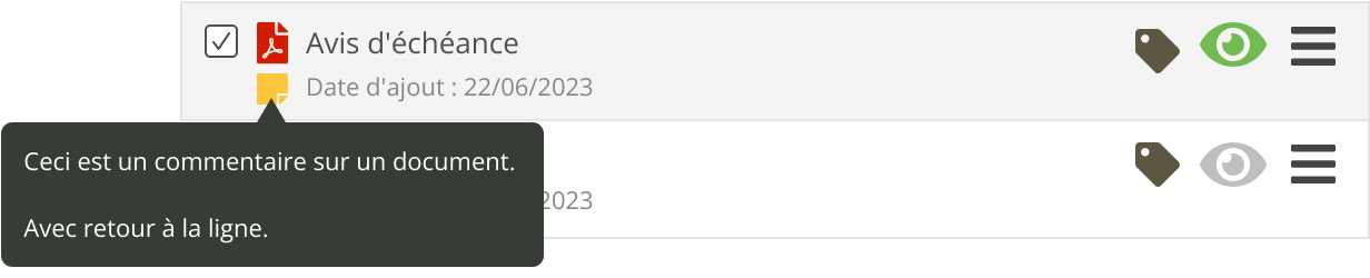Sur chaque document de la GED, une nouvelle icône peut apparaitre sous l’icône de type de document, en forme de note jaune. Il n’apparait que s’il existe une note et la présente au survol dans une infobulle.